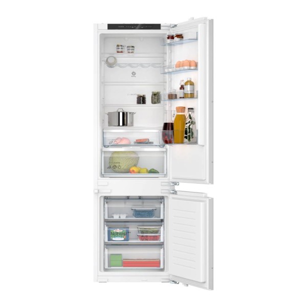 Este frigorífico combi de integración Balay 3KID834F ofrece un volumen total útil de 290 litros, repartidos entre 215 litros para el refrigerador y 75 para el congelador. Con unas dimensiones de 193,5 cm de alto, 55,8 cm de ancho y 54,8 cm de profundidad, se adapta perfectamente a tu espacio, proporcionando gran capacidad en un diseño compacto.