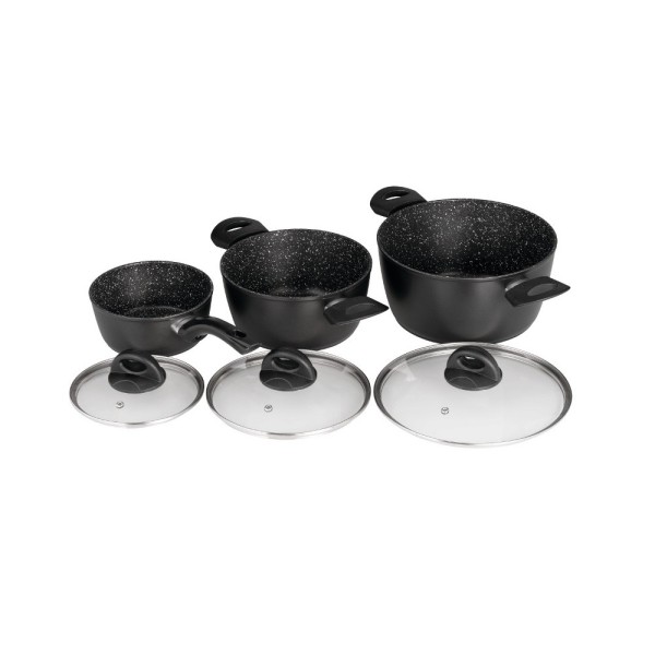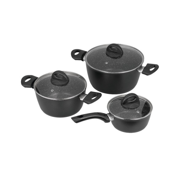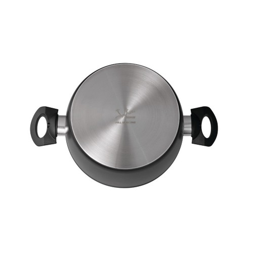 Batería de cocina 3 piezas con tapas. Fondo difusor inducción total y base sandwich de 3 mm para mantenimiento, control y difusión perfecta del calor.